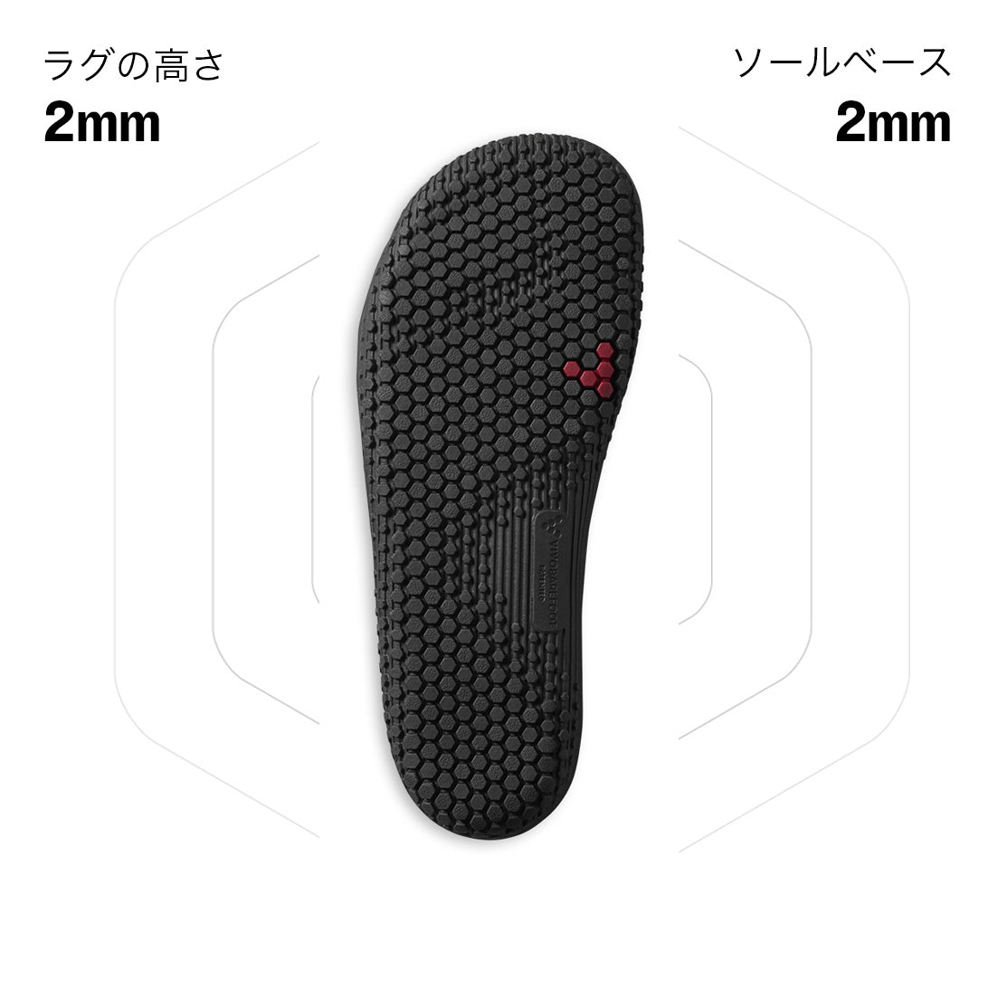キッズ・アーバンプレイ・アウトソールは、遊び場やコンクリートジャングルに耐える粘着性のあるゴムで作られています。2mm厚のベースと2mm高のラグを備えた六角形のデザインは、しっかりとしたグリップを叶え、自然な動きと自由をもたらします。究極の柔軟性、つま先の保護、接地感、成長期の足が必要とするものを備えたデザインです。