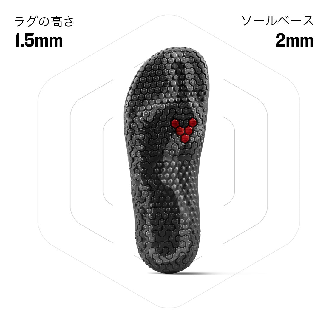 様々な地形で最高のグリップ力と耐久性を発揮するよう設計されています。トラクションを強化した2mm厚のソールに1.5mm高のラグが付いています。中足部の高さのあるサイドウォールはクロストレーニングを念頭にデザインされており、横方向の動きや方向転換の際に最適なサポートを提供します。柔軟性を損なうことなく、アクティブな足をサポートします。