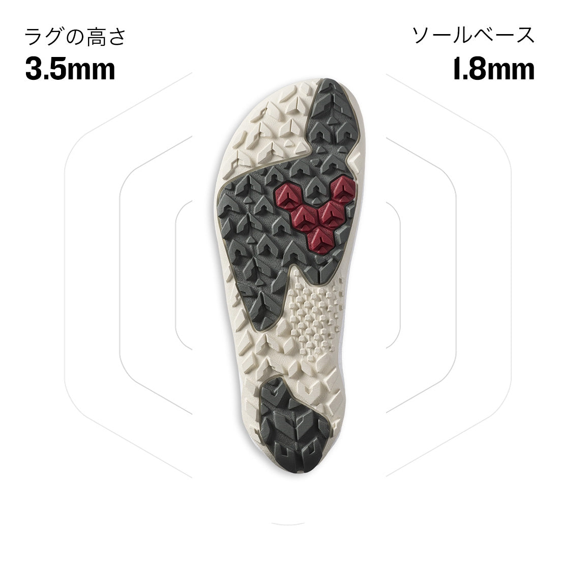 これまでで最も軽く、最も俊敏なトレイル用アウトソール。起伏に富んだ地形でのファストハイクやトレイルランニングのためにデザインされています。グリップ力を最大限に高め、摩耗に強く、耐久性にも優れた新しい構造を採用しました。