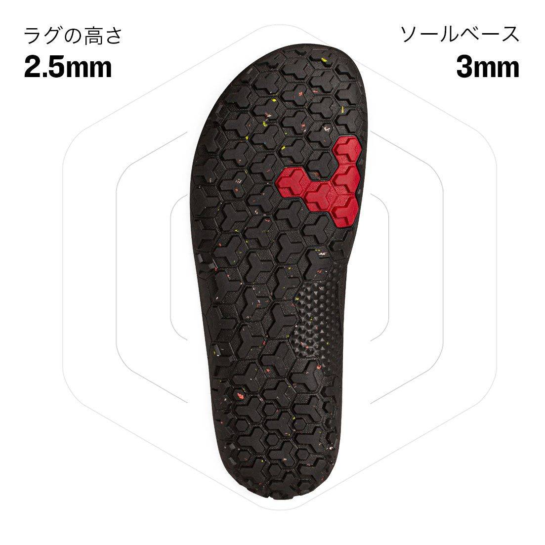 高い摩擦抵抗で、どんな地形にも吸い付くようなグリップ力を発揮するコンパウンド・ラバー製ファームグラウンド(FG)アウトソールを採用。足裏でしっかり地面を感じ取りながら、3mm厚のベースと2.5mm高のラグにより、路面が濡れていても乾いていても、岩場でも硬い地表でも、抜群のグリップ力を発揮します。アーチはより細かい突起状のラグデザインを採用。局所的にグリップ力を高め、テクニカルなトレイルにも挑戦できます。