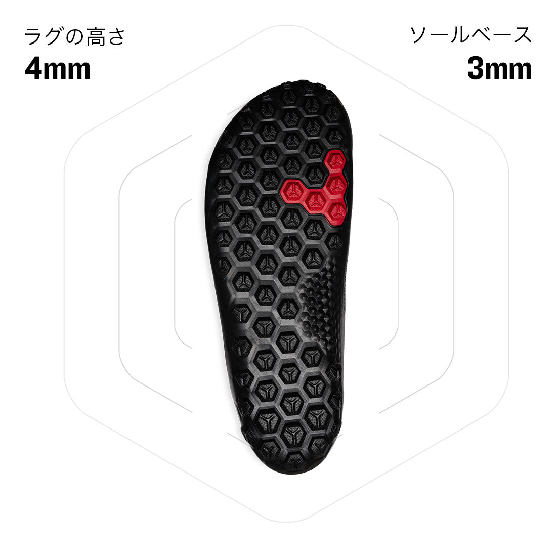 新しく改良されたFG2ソールは、グリップ力とトラクションを高めるため、3mmのベース厚と4mmのラグ高で、より深いラグを備えています。六角形状で粘りのあるラバーコンパウンドと、より細かい突起状のラグを採用したアーチデザインにより、局所的にグリップ力を高め、テクニカルなトレイルにも挑戦できます。路面が濡れていても乾いていても、コンクリートでも岩場でも、接地感とグリップ力が最大になるように設計しました。