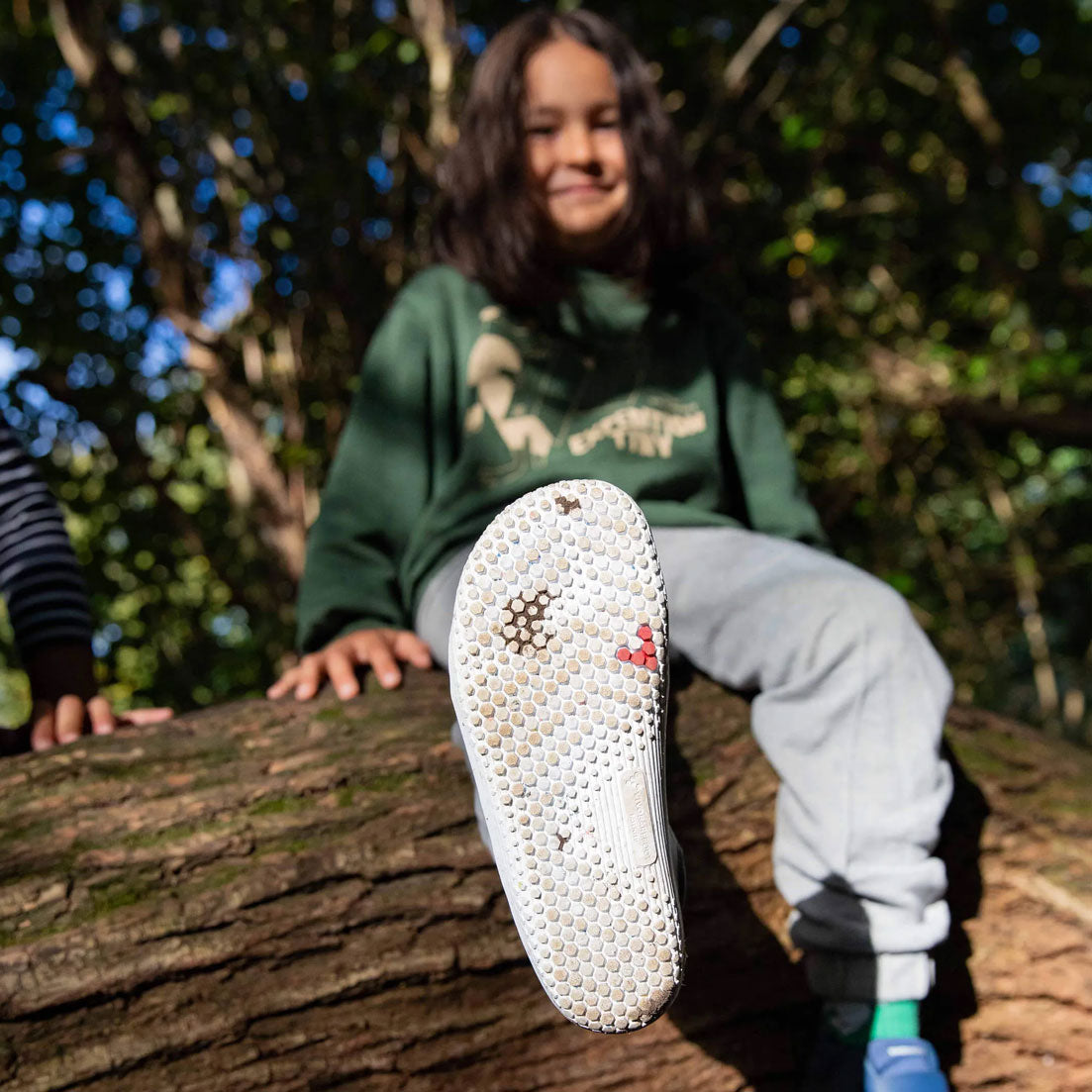 成長の早い足のためにデザインされたキッズマルチテレインソールは、究極の柔軟性とつま先の保護、地面の感触のすべてが得られるアウトソールです。2mm厚のベースと2mm高の六角形のラグデザインにより、ワイルドな足が地面を感じながら自然に動くことができます。