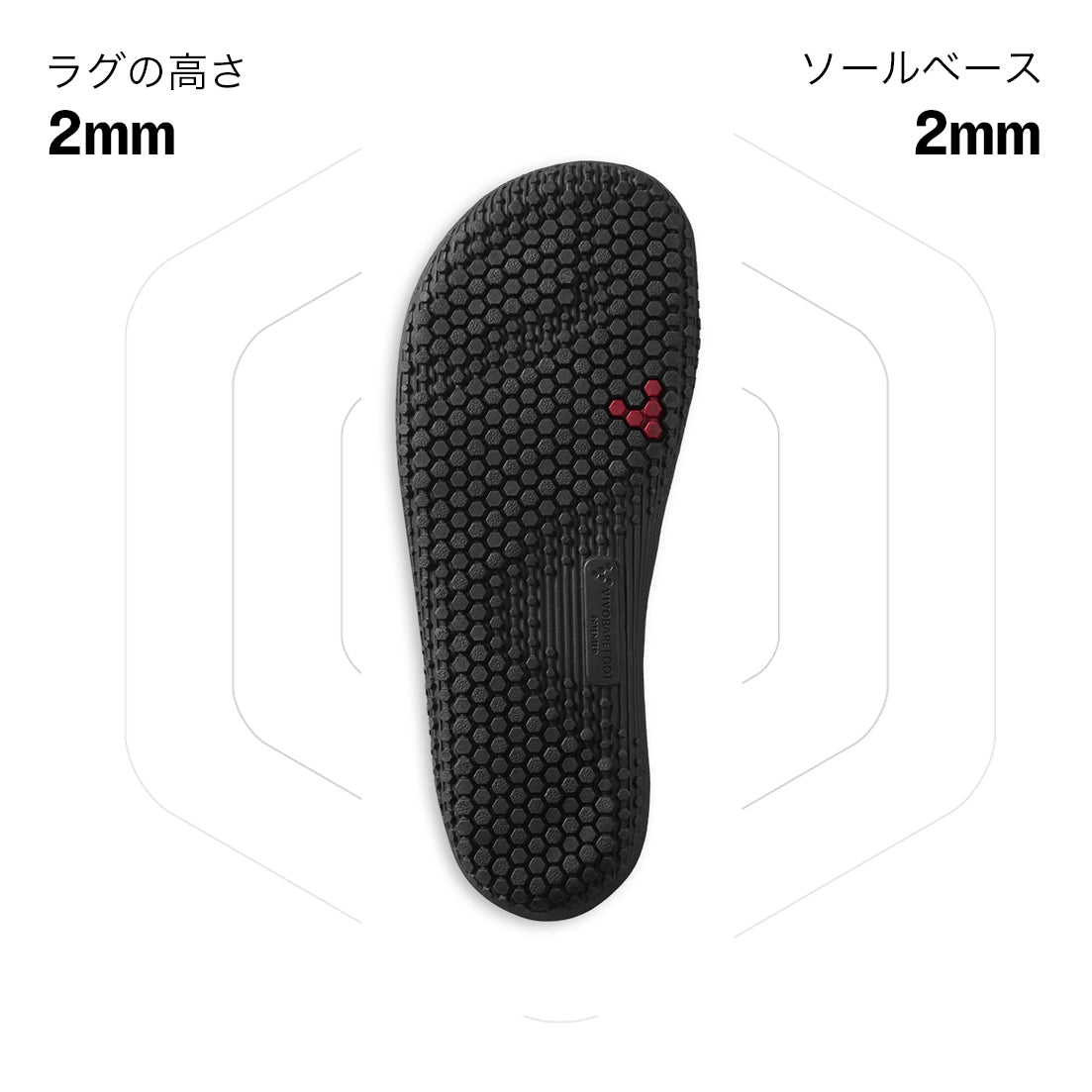 キッズ・アーバンプレイ・アウトソールは、遊び場やコンクリートジャングルに耐える粘着性のあるゴムで作られています。2mm厚のベースと2mm高のラグを備えた六角形のデザインは、しっかりとしたグリップを叶え、自然な動きと自由をもたらします。究極の柔軟性、つま先の保護、接地感、成長期の足が必要とするものを備えたデザインです。