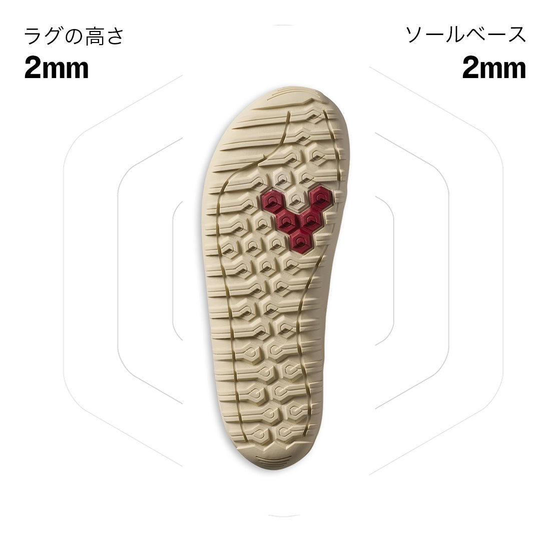 キッズ・アーバンプレイアウトソールは、遊び場やコンクリートジャングルに耐える粘着性のあるゴムで作られています。2mm厚のベースと2mm高のラグを備えた六角形のデザインは、しっかりとしたグリップを叶え、自然な動きと自由をもたらします。究極の柔軟性、つま先の保護、接地感、成長期の足が必要とするものを備えたデザインです。