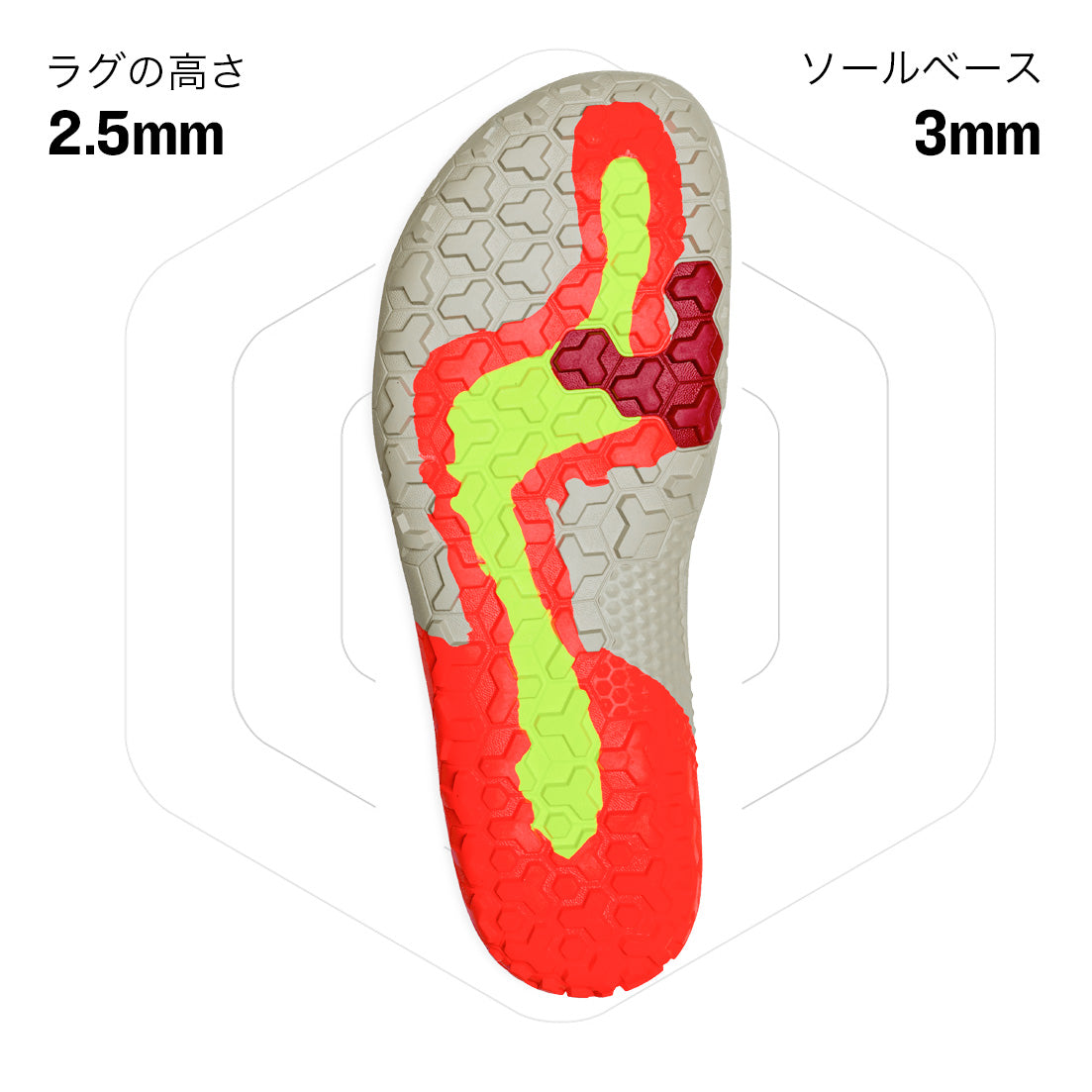 高い摩擦抵抗で、どんな地形にも吸い付くようなグリップ力を発揮するコンパウンド・ラバー製ファームグラウンド(FG)アウトソールを採用。足裏でしっかり地面を感じ取りながら、3mm厚のベースと2.5mm高のラグにより、路面が濡れていても乾いていても、岩場でも硬い地表でも、抜群のグリップ力を発揮します。アーチはより細かい突起状のラグデザインを採用。局所的にグリップ力を高め、テクニカルなトレイルにも挑戦できます。