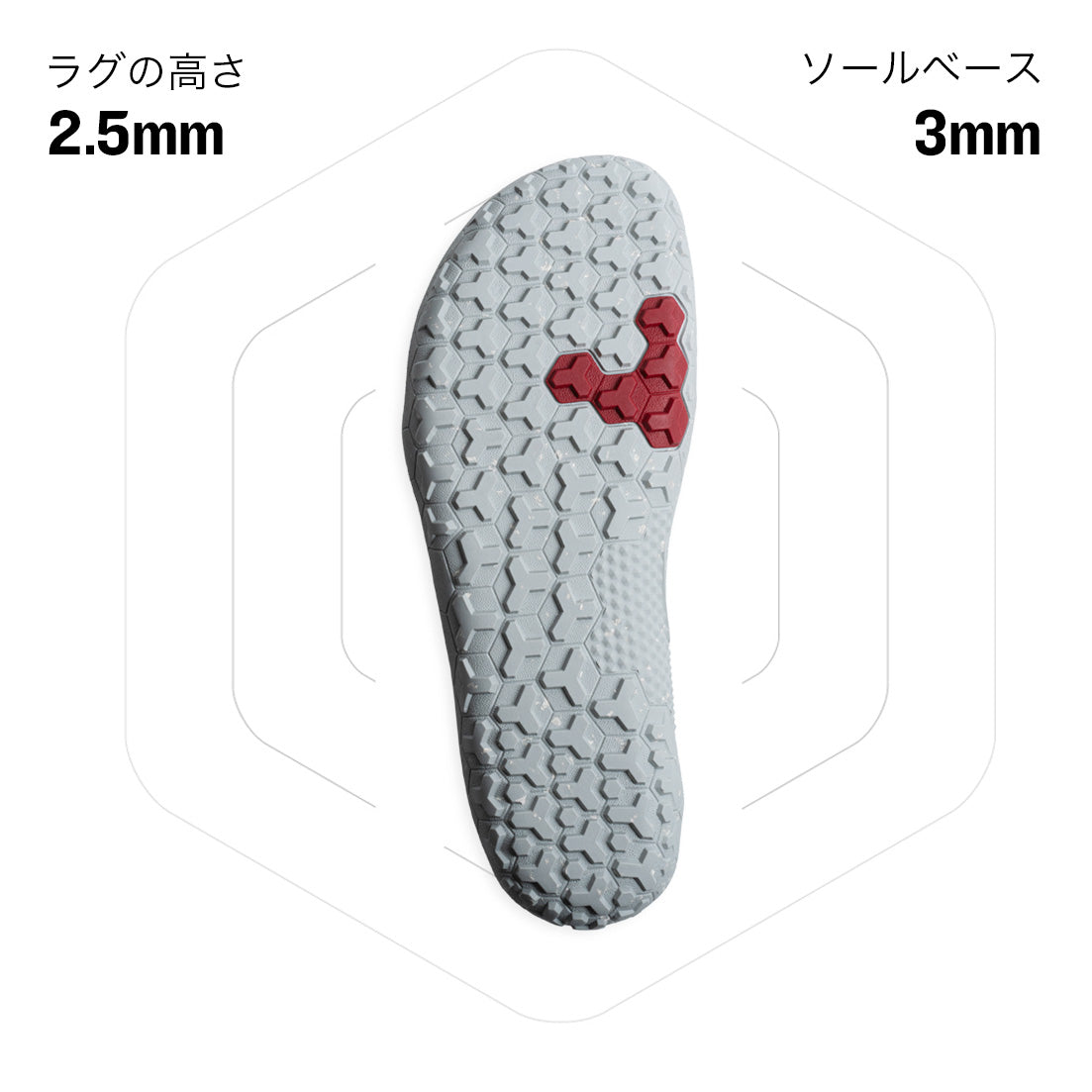 アウトソールはすでに構造上リサイクル可能な素材を使っており、アッパー素材もリサイクル可能な100%ポリエステルで作ることに挑戦しています。新しいプライマストレイル FG 3.5のアッパーは、ポリエステルの割合を34%から76%に引き上げています。そのうち93%はリサイクル素材です。なぜ100%ではないのでしょうか?アッパーの一部には、ポリエステルではまだ補えない耐久性が必要だからです。Vivobarefootは引き続きパートナーと協力し、このパズルの最後の1ピースを見つけ出すべく奮闘中です。