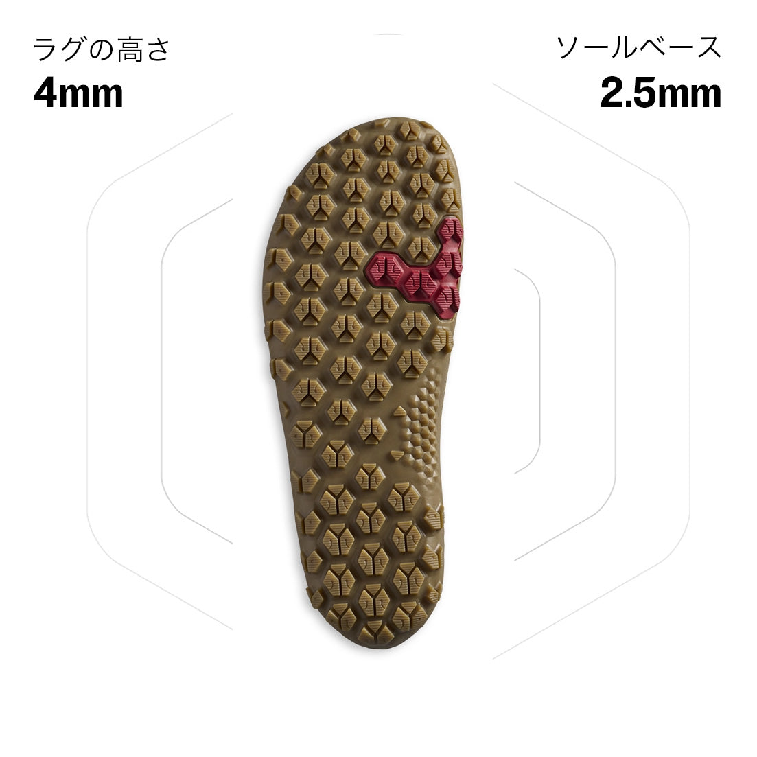 オールテレイン・アウトソールは、強化されたラグデザインとハイトラクションゾーンの戦略的な配置により、グリップ力を向上させています。ラグは溝を増やし、1.5mm高くすることでグリップ力と耐久性を高め、スリップを軽減。また、ソールベースを薄くすることで地面との距離を縮め、自然な履き心地を実現しています。Vivobarefoot UKのアンバサダーによるテストでは、様々な地形において優れた評価を得ています。