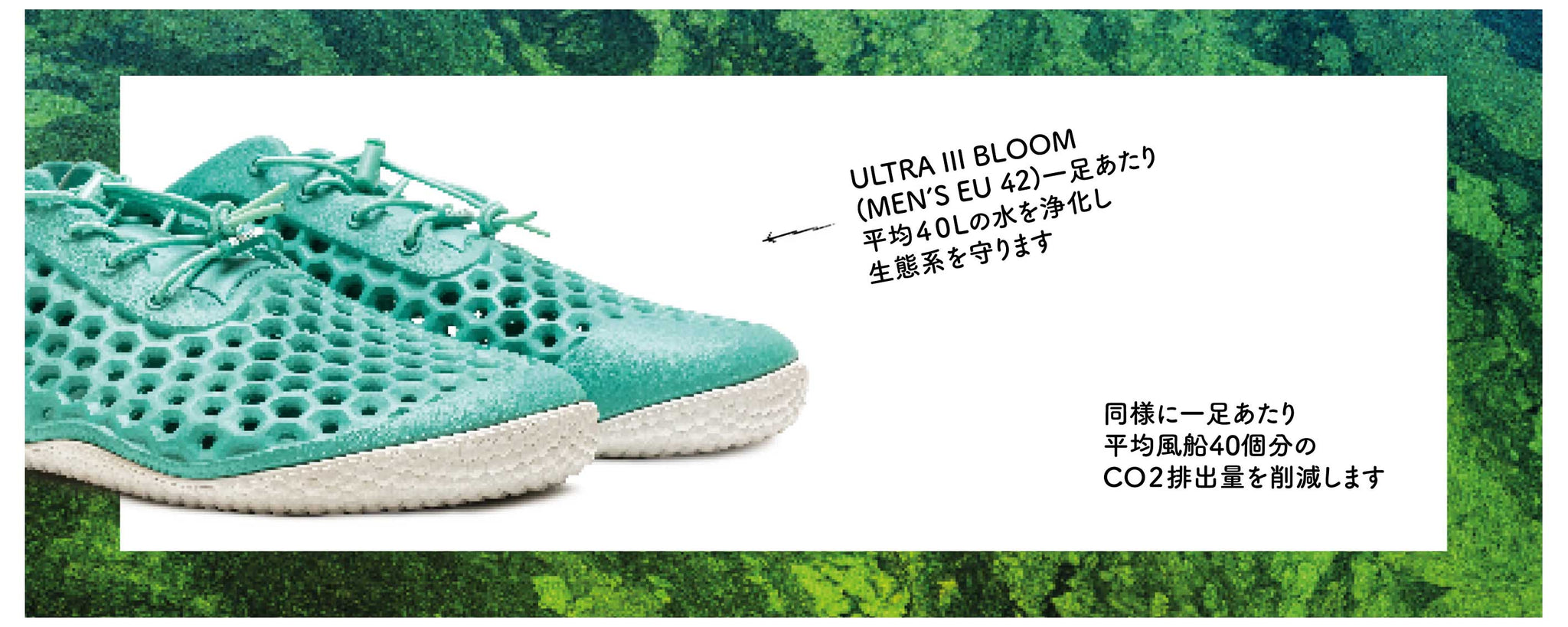 100%生物由来で、再利用や堆肥化が可能な完全循環型の素材を開発することです。いまはまだ藻類の使用率はわずか5%ですが、BLOOM社や他の企業と密接に協力し、実現を目指しています。次世代の素材で作られた靴をあなたの足元にお届けできる日を楽しみにしています。
