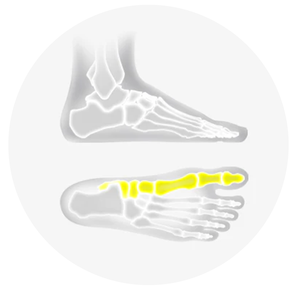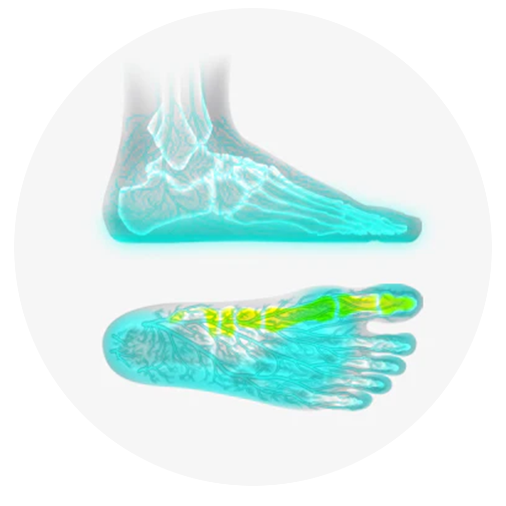 足は体を支える土台です。足のアーチ(土踏まず)は本来バネのように作動します。靴に「アーチサポート」が付属していなければ、生まれつき備わっている筋肉と靭帯がアーチを支え、ゴムのように反跳します。走るときは、体重のおよそ2倍の荷重が体にかかりますが、アーチと足首でこの衝撃の54%を吸収できる構造になっています。このアーチの機能を使わず、かかとで着地すると、代わりにひざと骨盤で走行時の衝撃を吸収しなければなりません。