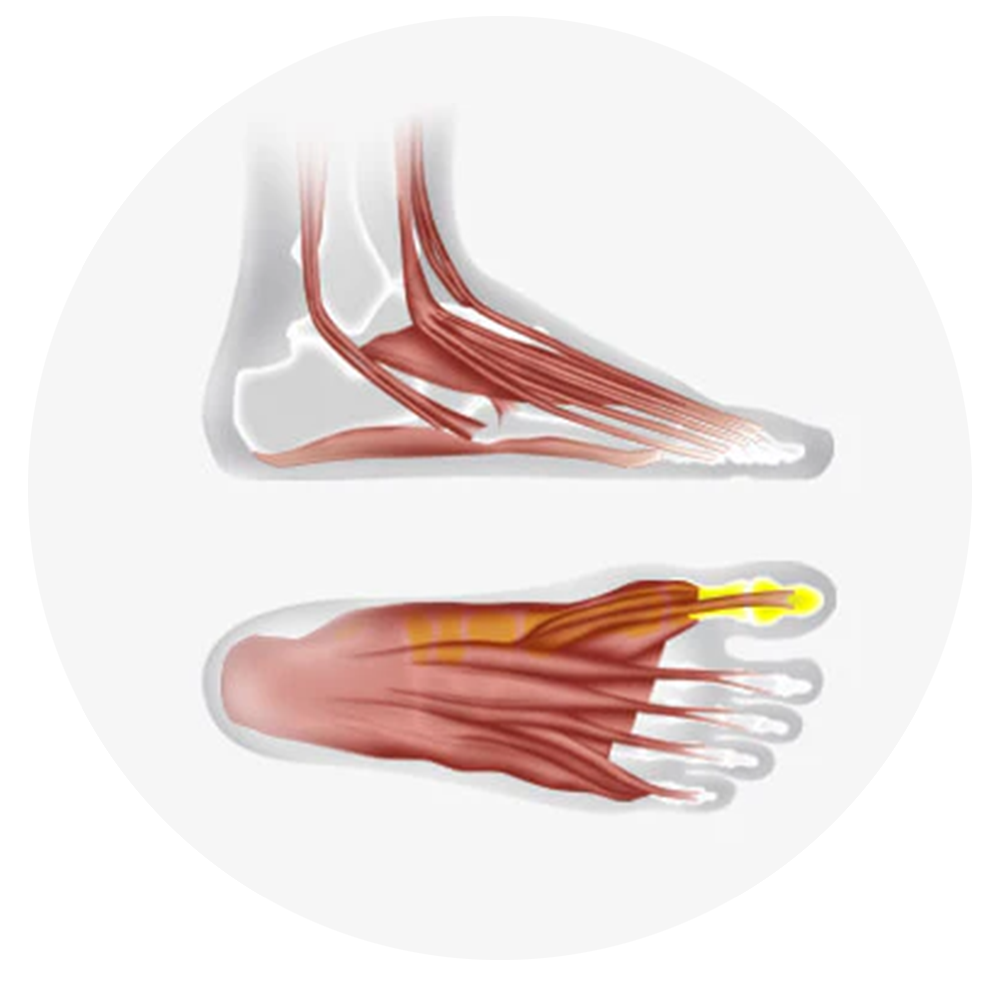 ソフトウェア(体の動き)の変化とハードウェア(姿勢や足の形)の因果関係は、裸足で生活する種族との比較研究からも明らかです。習慣的に靴を履いている人の足は、内在筋や靭帯、足底筋膜が弱体化しています。足裏のアーチが崩れると、筋肉や靭帯の反跳力も弱まり、負傷の原因となりうるのです。靴が原因のトラブルで代表的なものが「モートン趾」(足の第二趾が母趾より長い)と「外反母趾」(母趾の内側への変形)です。およそ30%の人は遺伝的にモートン趾を持って生まれますが、それ以外の人は、足に合わない靴が原因で後天的にモートン趾になります。