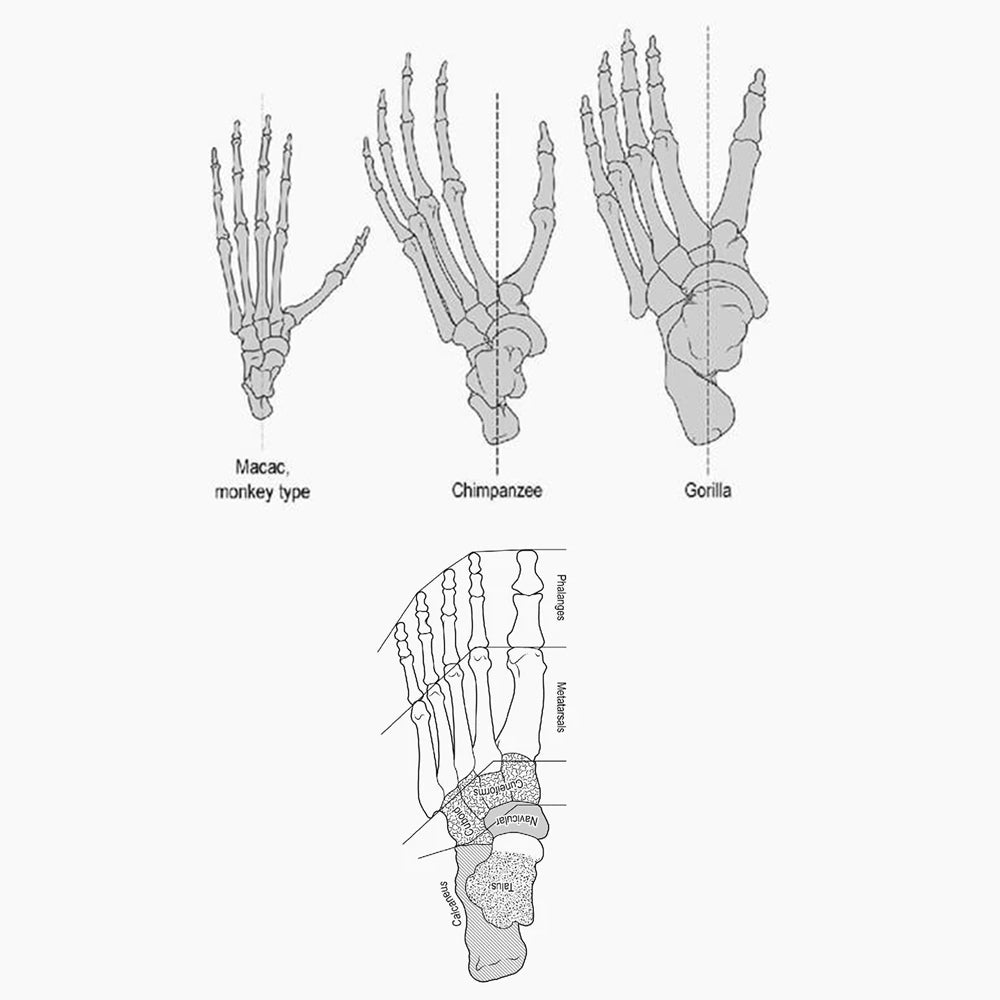 母趾(親指)と第二趾の骨の長さは同じです。母趾の骨はまっすぐ前方に伸び、体を支えるアンカーであり、回転軸でもあります(他の趾より4倍の太さと密度を持ちます)。頑丈な距骨(きょこつ:足首の奥の骨)は、足の動きに応じて足首をロック(固定)したり、それを解除(衝撃吸収)したりします。