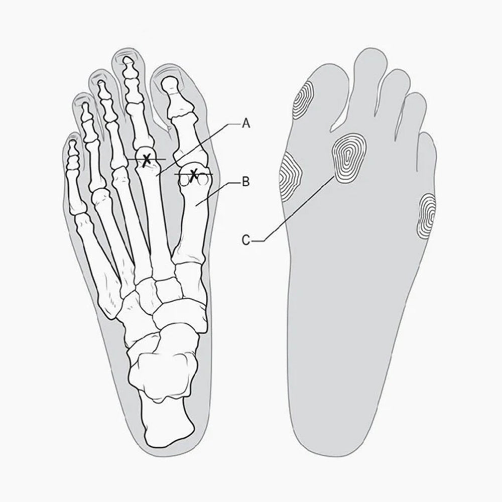 歩行時のロッカー機能:足には重心移動を円滑にする3箇所の「ロッカー(回転運動の支点)」があります;ヒールロッカー、アンクルロッカー、そして前足部(母趾)ロッカーです。母趾が頑丈でかつ柔軟に曲がることが、健常歩行には欠かせません。母趾がてこの支点となり地面を押して、体を前へ移動させる構造になっています。