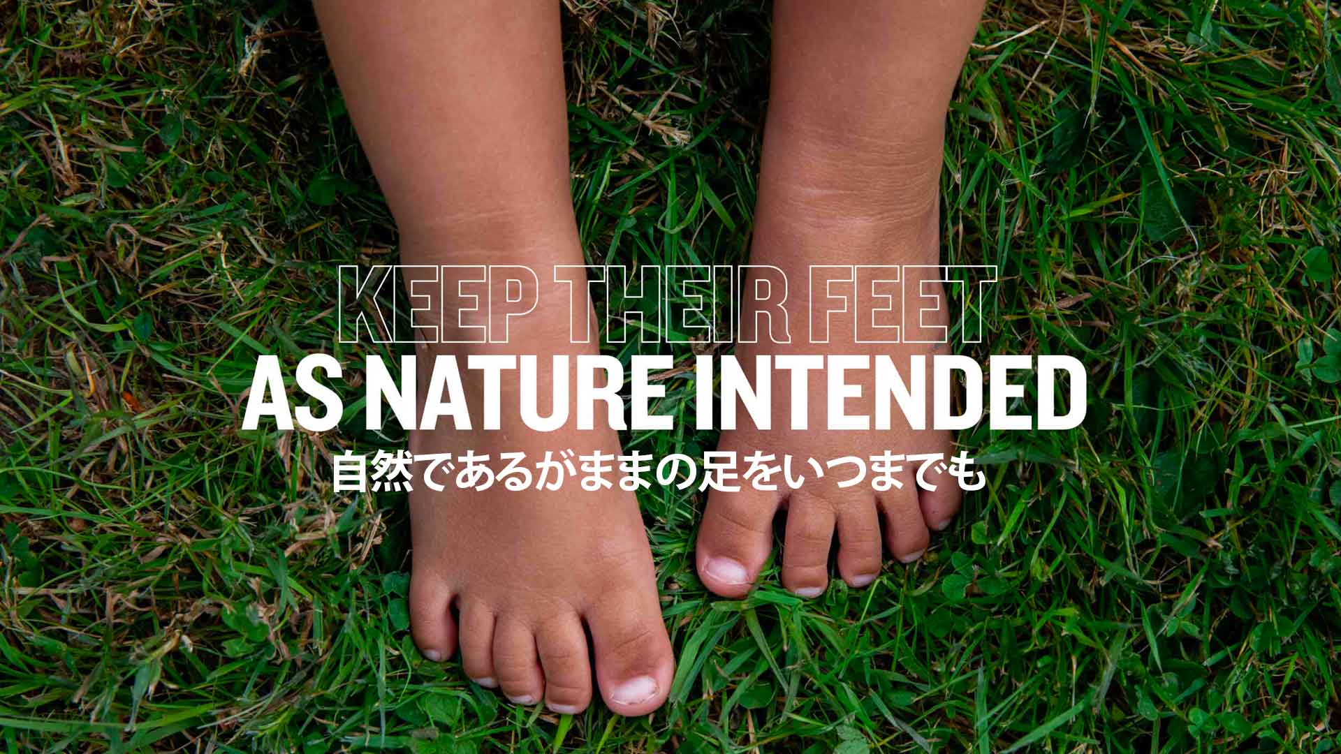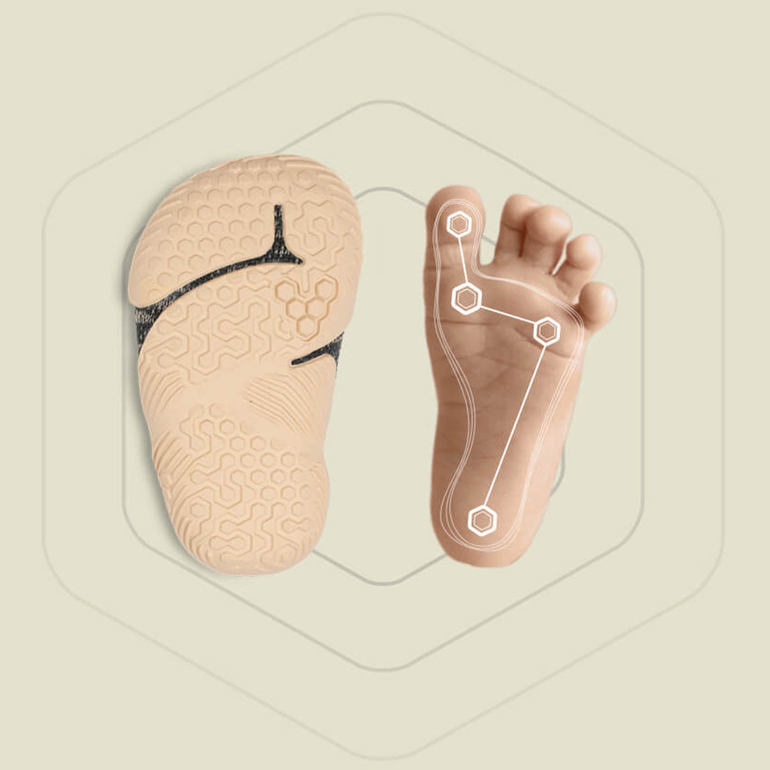 裸足に近い感覚をもたらすことで、のびのびとした自然な動きとバランスを育みます。お子さまの成長と探求心を邪魔しないシューズです。