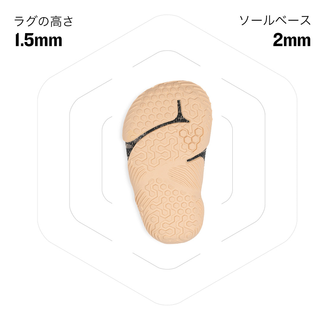 ネイチャーフレックス・アウトソールは、2mmの極薄ベースに1.5mmのトレッドパターンを配置。他に類を見ない柔らかさで、自然な動きと素足のような感覚を叶えました。ハイハイから伝い歩き、歩き始めのつま先周りをラバー製のトゥラップで補強しています。